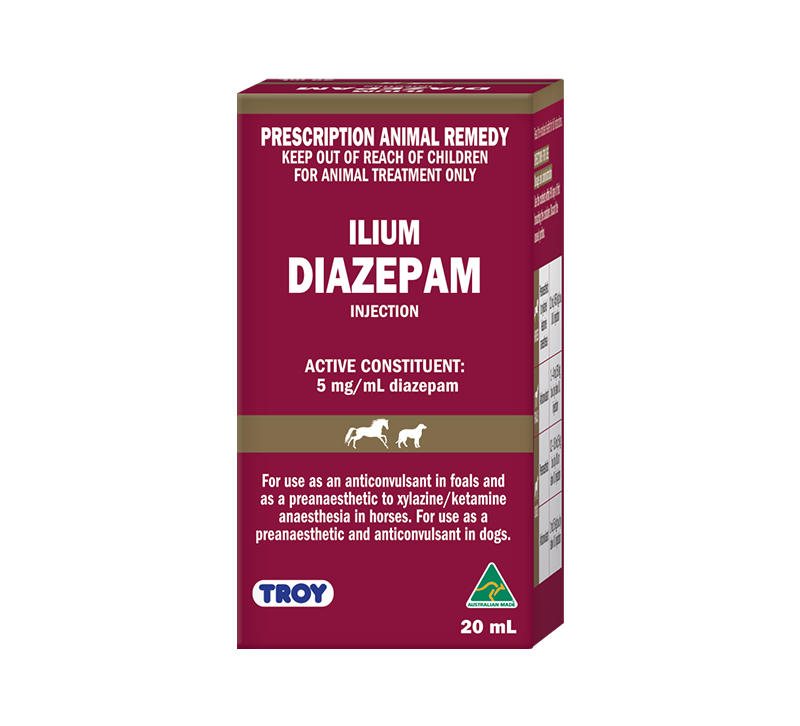 Contains 5mg/mL DIAZEPAM for use as an anticonvulsant in foals and as a preanaesthetic to XYLAZINE/KETAMINE anaesthesia in horses. For use as a preanaesthetic and anticonvulsant in dogs.